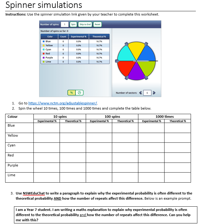 NSW EduChat has also been valuable in helping students consolidate learning after hands-on activities. One example was to explaining the difference between experimental probability and theoretical probability. A samples of the activity sheets is below.