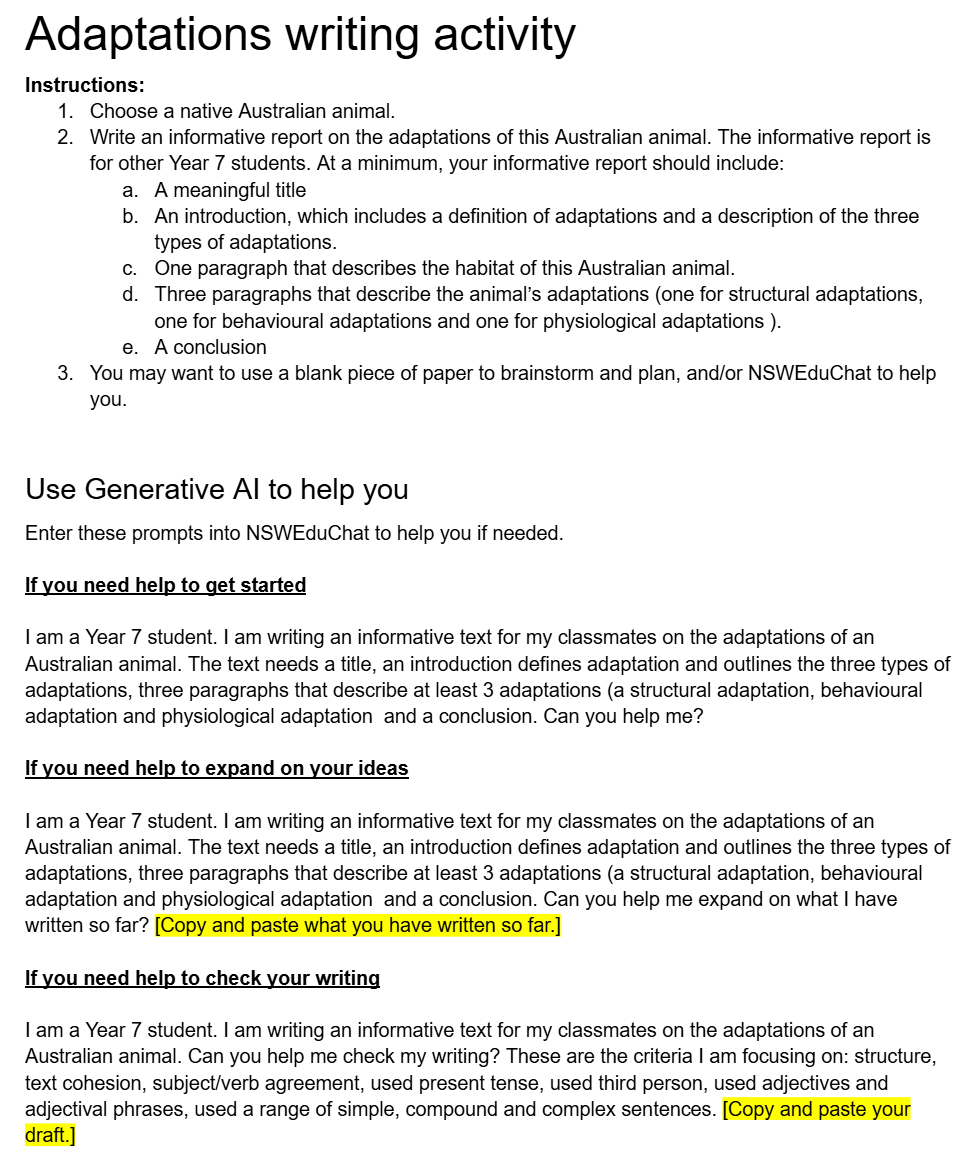 Students were writing an informative text on adaptations of Australian animals, and NSWEduChat was used in a differentiated way: