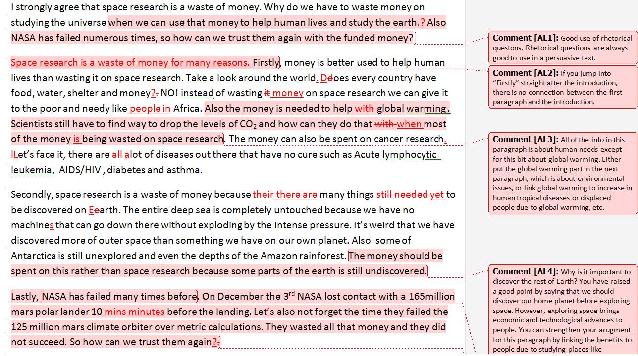 I followed a very similar process with my Year 10s. My Year 10s are writing a persuasive text on whether space research is a waste of money. Like the Year 7s we looked at a sample persuasive text to analyse the structure and language features. They then worked in small groups to write a persuasive text on whether they believed the Big Bang theory explains the origin of the universe. Like the Year 7s I marked their writing with them. Since they had 1:1 laptops I used Track Changes and Comments in Microsoft Word to make corrections and record comments on what they have done well and what they need to improve on while I’m speaking to them. Students also marked each other’s writing using marking criteria.