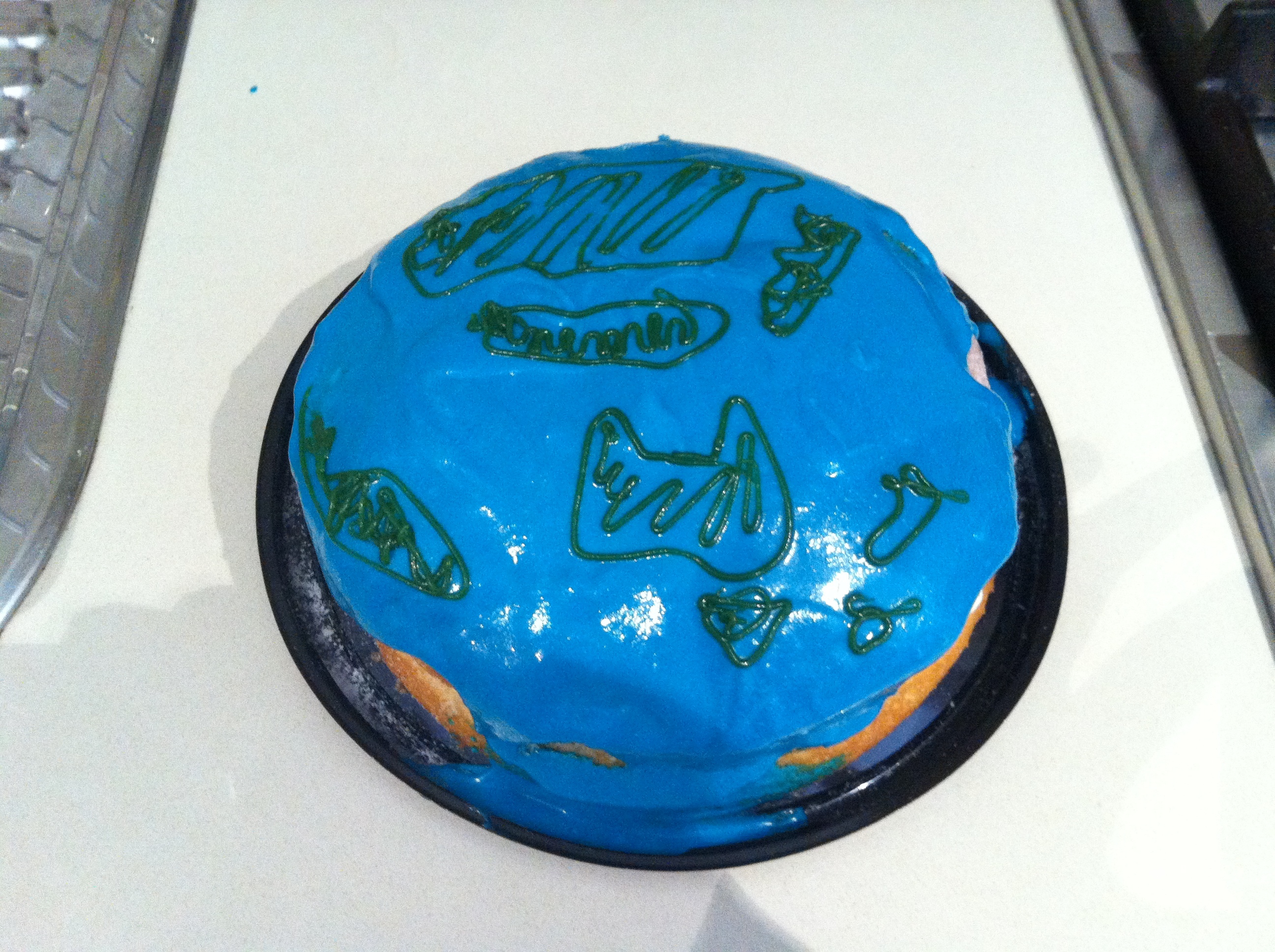 It was a store-bought cake from Coles. I made some vanilla icing with added blue food colouring and spread it on top of the cake. I then used icing writing pens to draw the continents.