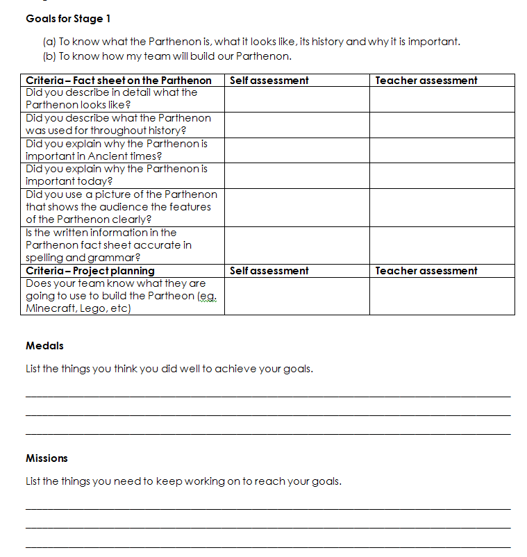 So for their next project, I will be embedding feedback cycles in the form of goals, medals and missions, which we already use for our writing tasks. Our next project will be The Parthenon Project. It will involve Year 7s building a model Parthenon that follows the golden ratio, a somewhat “magical” number that the ancient Greeks used a lot in their architecture and art (and we still use today). Year 7s will be able to construct their Parthenon in Minecraft or with other materials like Lego. The project will have four stages: (1) Research and project planning; (2) Planning the Parthenon; (3) Constructing the Parthenon; and (4) Presenting the Parthenon. Each stage will involve student self assessment and teacher self assessment to allow students to monitor their own progress and learning process. The assessment will be based on a product that students produce at the end of each stage.