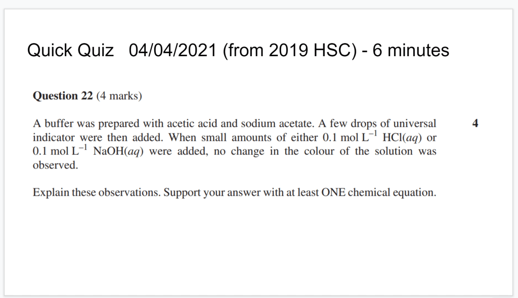 Quick Quiz Google Slides is in a post that is sorted to be on top of Google Classroom in the Classwork tab, which makes it really easy for me and my students to access at the start of each lesson.An example Quick Quiz question for my Year 12 chemistry classAn example Quick Quiz question for my Year 12 chemistry class